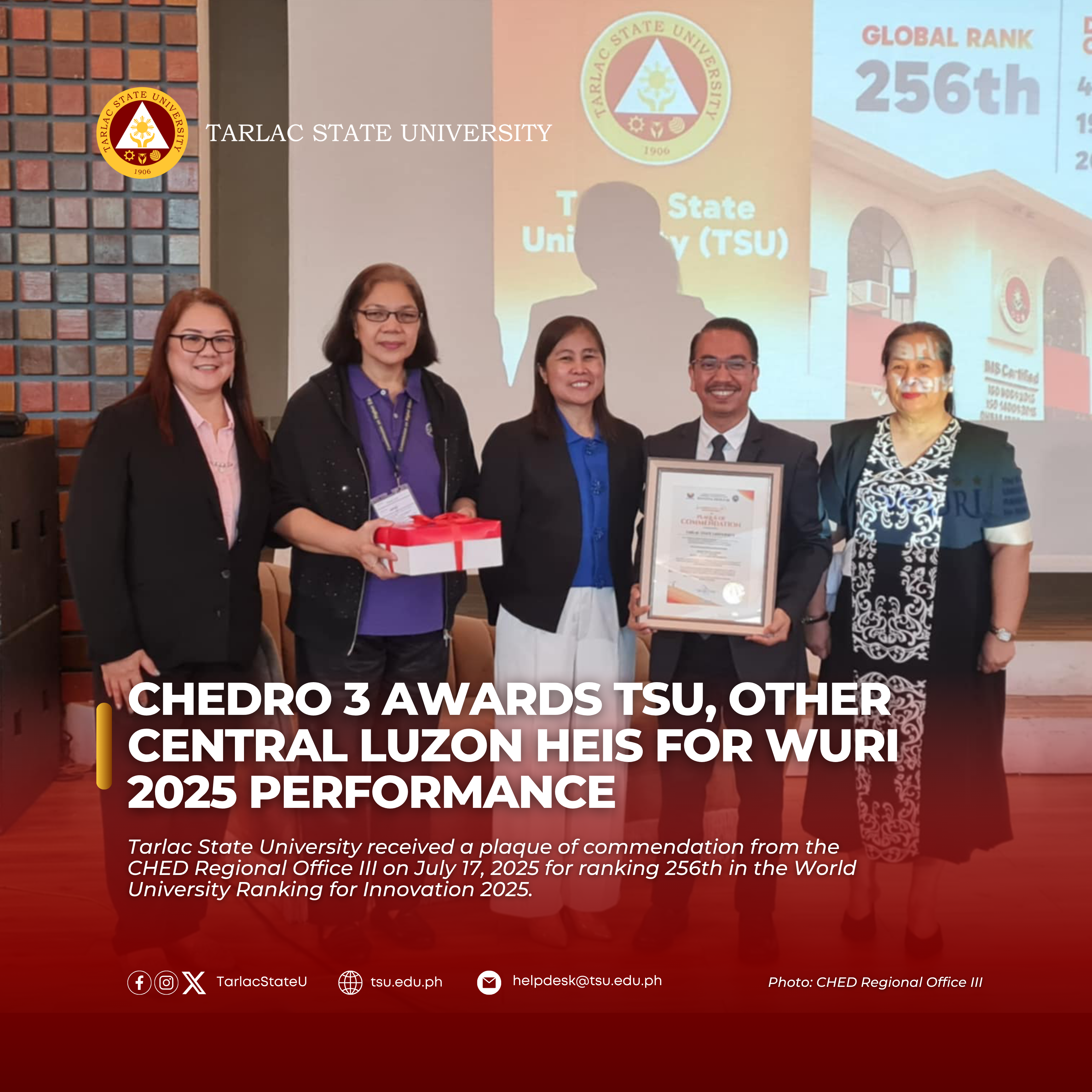 Tarlac State University received a plaque of commendation from the CHED Regional Office III on July 17, 2025 for ranking 256th in the World University Ranking for Innovation 2025.