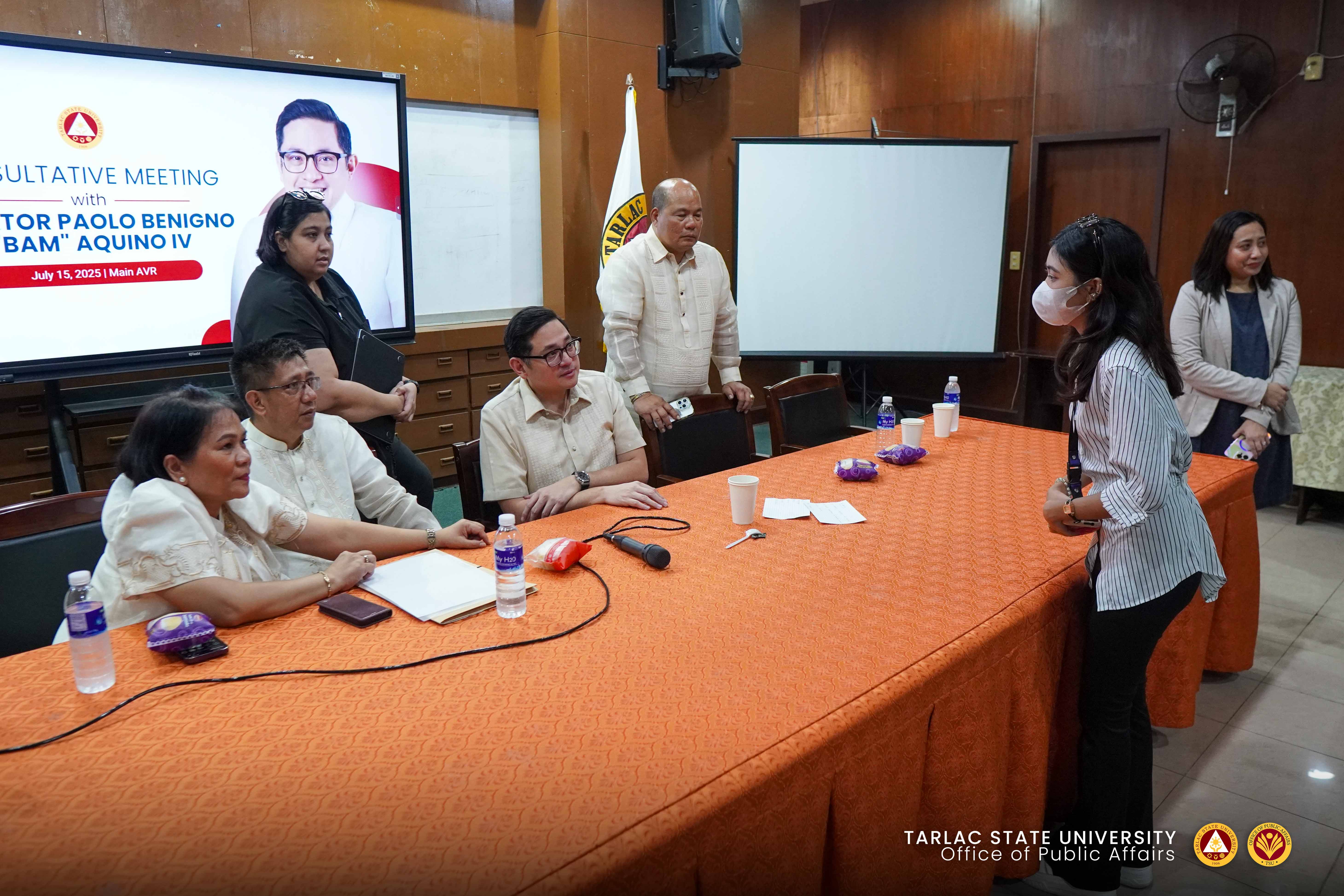 Tarlac State University's key officials, some Board of Regents members, and students attended a consultative meeting with Sen. Paolo Benigno "Bam" Aquino IV on Tuesday afternoon (July 15) at the Main AVR, before the 36th Commencement Exercises.