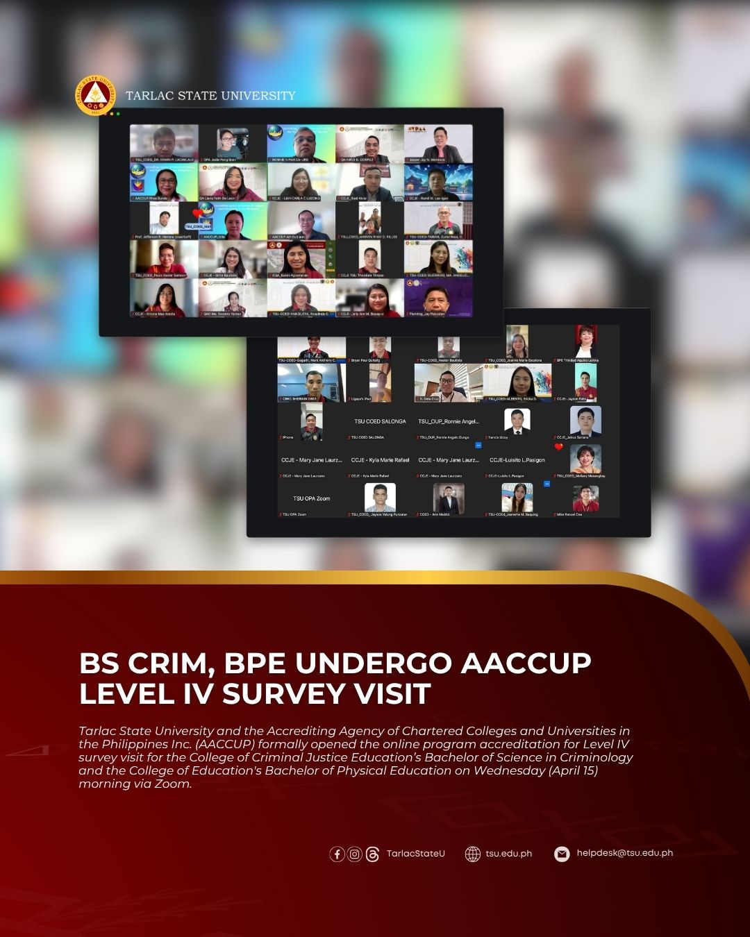 Tarlac State University and the Accrediting Agency of Chartered Colleges and Universities in the Philippines Inc. (AACCUP) formally opened the online program accreditation for Level IV survey visit for the College of Criminal Justice Education’s Bachelor of Science in Criminology and the College of Education's Bachelor of Physical Education on Wednesday (April 15) morning via Zoom.